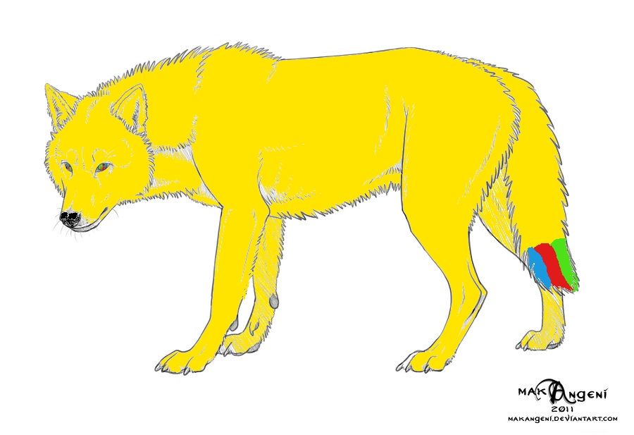 Kinézete:Citromsárga szőr, bal(vagy jobb, nem tudom) mellső lábán egy fehér jegy található.Farkas vége piros, zöld, és kék.Szeme szivárványszínű(vagyis majdnem.szintén piros,zöld és kék)